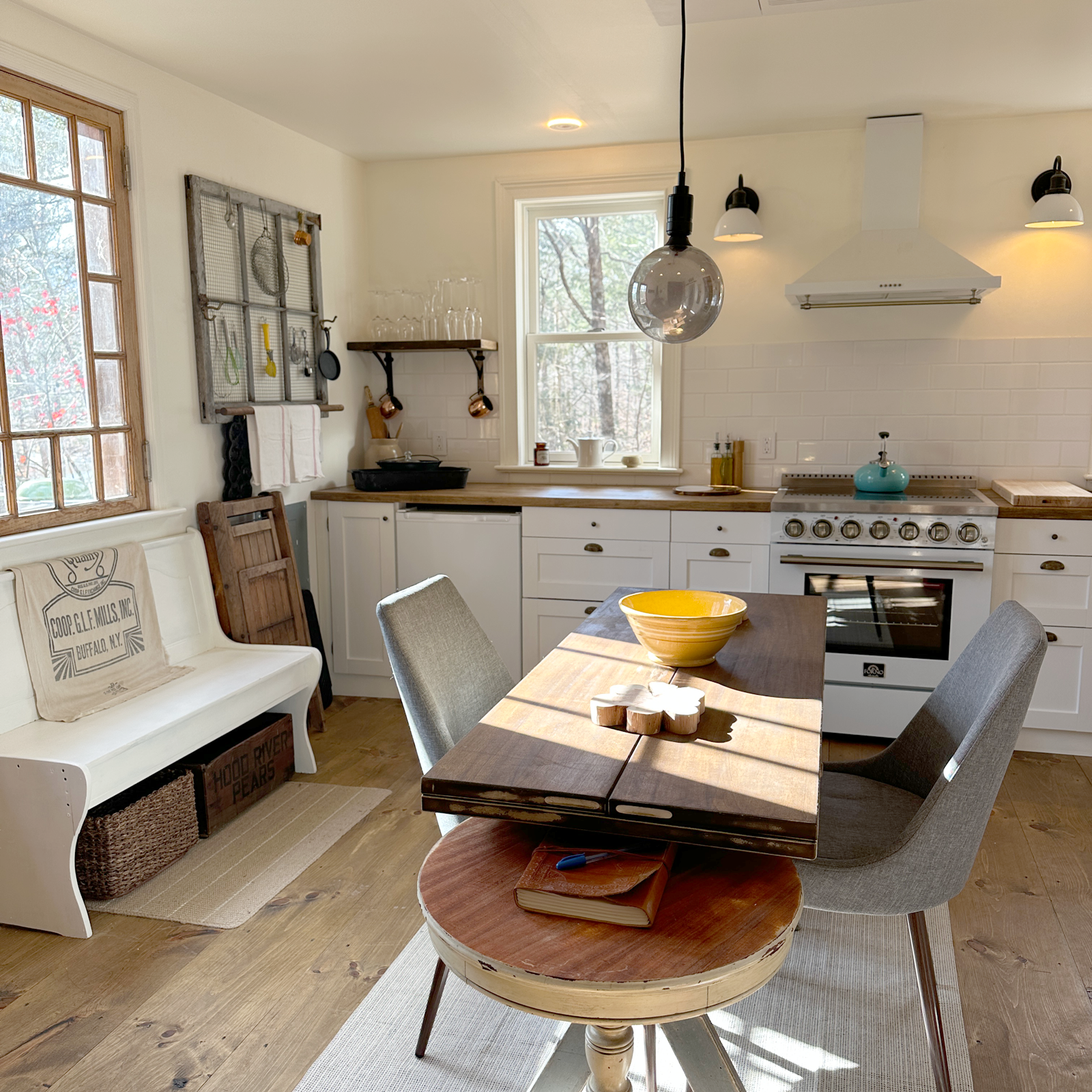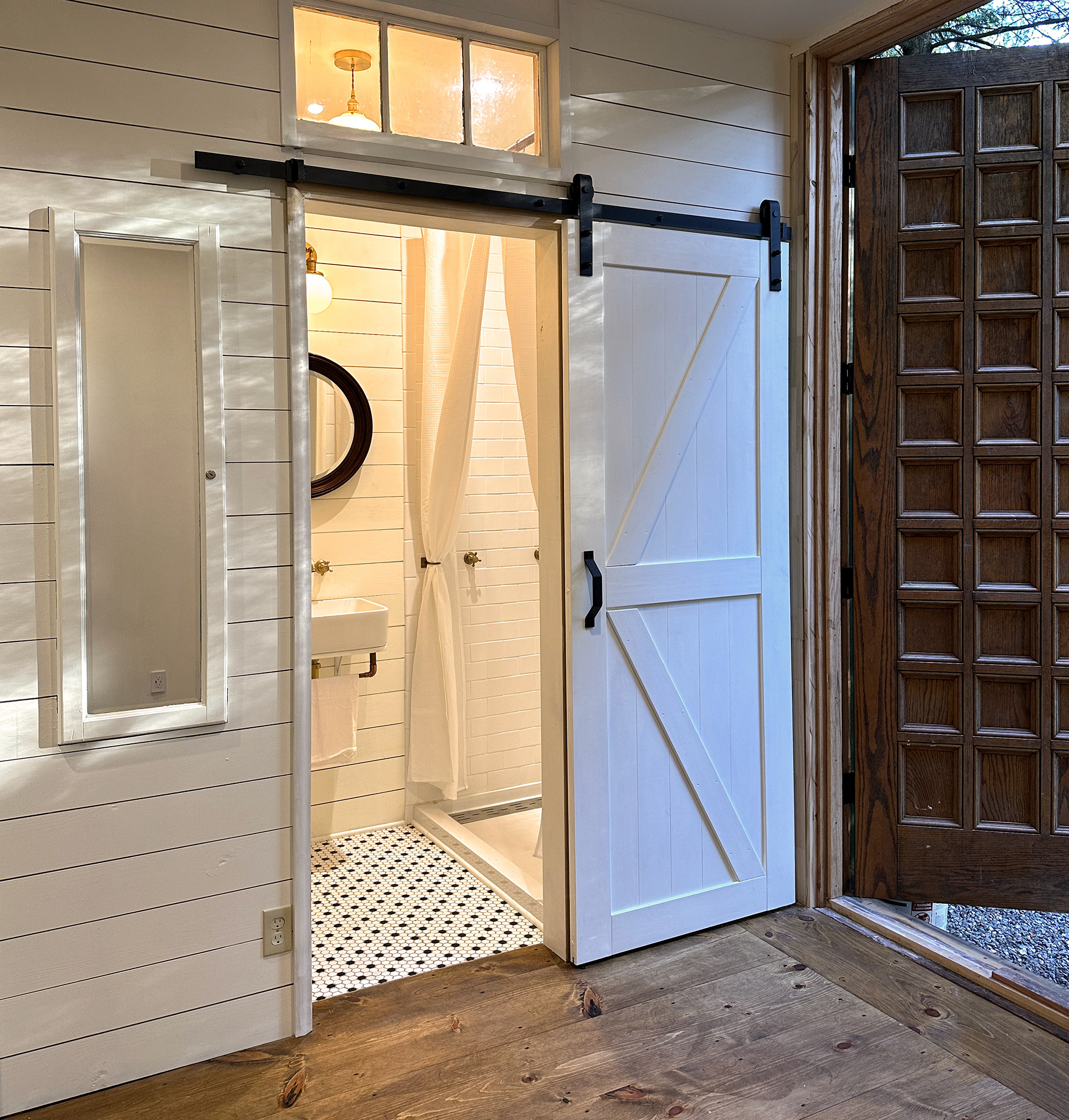 Enter through a rustic post-and-beam portal into a Mediterranean-inspired garden, where fragrant herbs and flowers flourish in gravel-lined beds, and a wood-fired pizza oven invites you to slow down and savor the art of cooking. Massive oak doors welcome you into the cozy cottage, where tranquility and comfort await.
